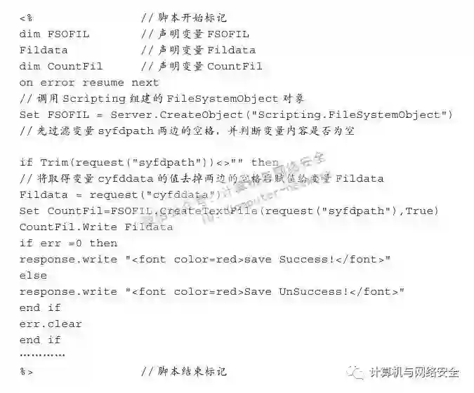 若脚本想要完成一些涉及其他文件或系统的工作,就一定要调用相应的组件。例如上面的例子代码中的Set FSOFIL=Server.CreateObject("Scripting.FileSystemObject")就是调用系统FSO组件的代码,中间括号里的Scripting.FileSystemObject便是FSO组件的特征,所以专杀工具只要扫描哪些文件里有这些代码就可以判定它调用了什么组件了。