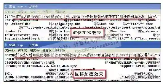 我们先来看看这两种方法的加密效果,如图6所示。通过此图可以看出,所谓的逆位法就是将脚本木马的代码都倒过来,而位移法则是使字母变成另外一个可显示的符号,汉字并没有变化。所以相对来说还是逆位法的加密效果比较好。