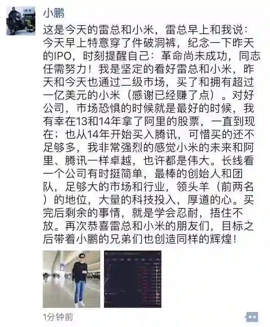 36氪讯,小鹏汽车董事长何小鹏在朋友圈表示:坚定的看好雷总和小米,也通过二级市场,买了和拥有超过1亿美元的小米(股票)。下单前并未与雷军做任何沟通,下单后告诉了小米的某位员工,后者转述给了雷军。雷军还特意对何小鹏表示了谢意。买入小米,除了和雷军是好友关系,彼此在需要的时候互相帮忙外,主要还是因为看好小米的未来。