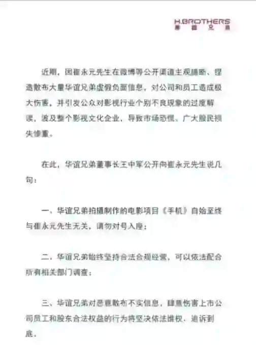36氪讯,华谊兄弟发布公告称:对恶意散布不实信息、肆意伤害上市公司员工和股东合法权益的行为将坚决依法维权、追诉到底。