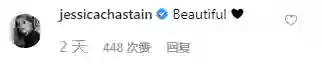 即将与她合拍好莱坞电影《355》的金球奖影后杰西卡•查斯坦(Jessica Chastain)在留言中大赞“Beautiful”。