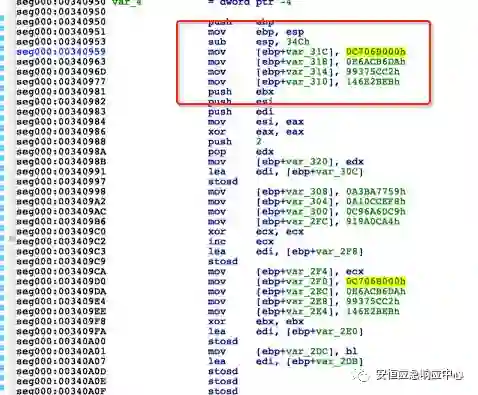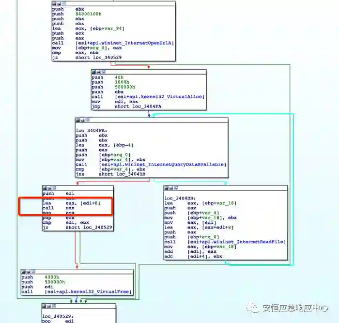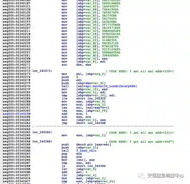 在该函数中包含大量解密操作后,在内存解密出Shellcode代码,动态计算出所需函数的api地址。