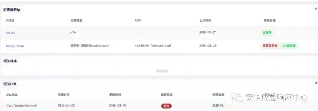 通过文件威胁分析平台的域名查询功能发现,该域名已经在2018年10月就修改了域名解析。