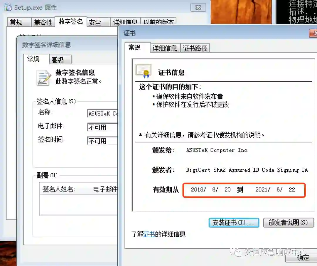 安恒安全研究团队第一时间拿到其中一个攻击样本(MD5:55a7aa5f0e52ba4d78c145811c830107),该样本包含有正常的数字签名“ASUSTeK Computer Inc.”,其证书的时间是6月20日以后,说明攻击者应该是在2018年6月20日开始进行恶意代码下发。