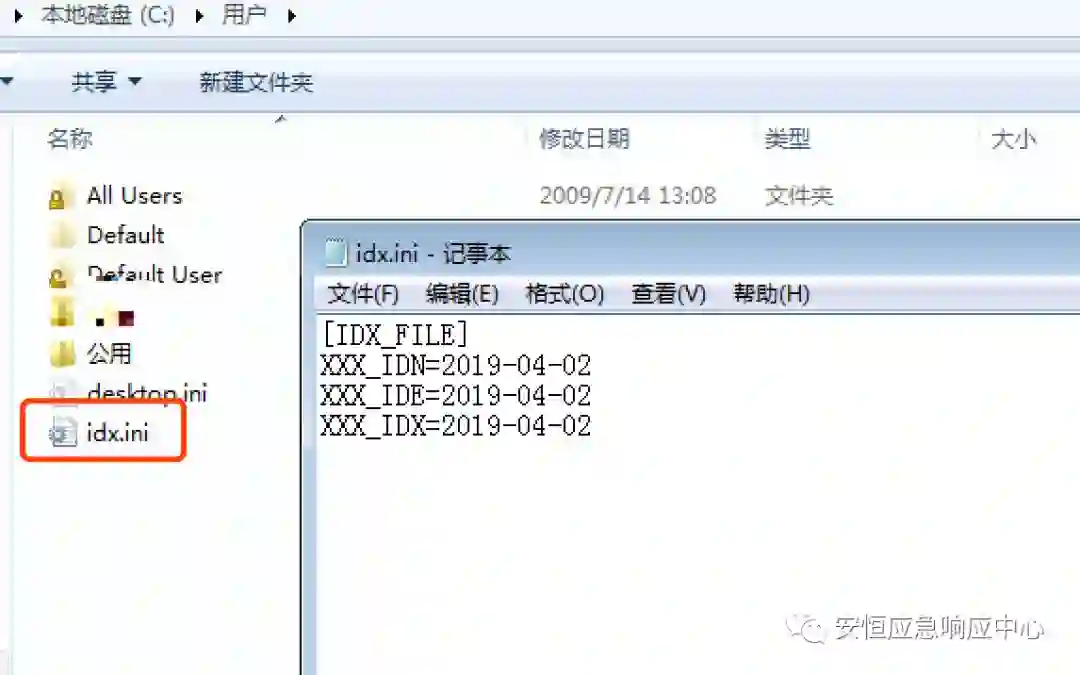 对于不符合黑客攻击的目标的电脑,该恶意程序将在其用户目录下面生产idx.ini的文件并退出,不进行任何恶意操作。