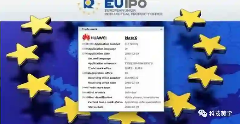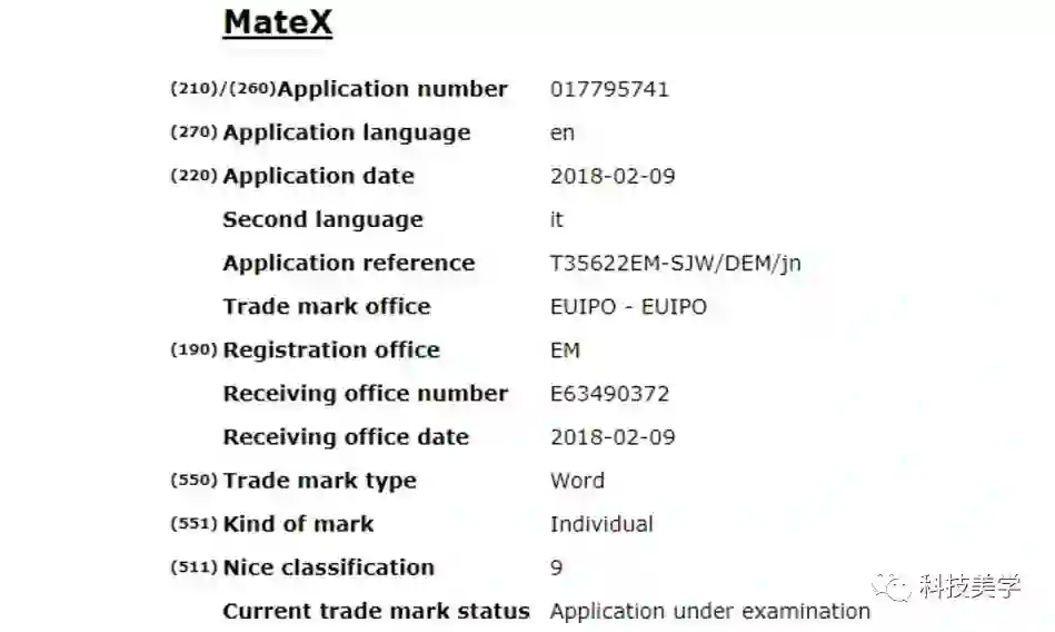 在欧盟知识产权局的官方网站上,“MateX”名称由华为驻英国代表提出,作为商标被归纳于手机、智能手机名录下。