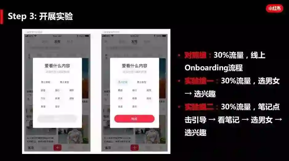 第三步,确定要做的事情之后,接下去就是具体的实施了。针对一些结果未知的改动,AB测试是个非常好用的方法。比如,我们针对预装渠道用户登录流程的改动,分三组做了实验。第一组用户和之前流程一样,第二和第三组用户我们都去掉了前面填写信息的页面,改成先看到内容,再填信息。其中不同的是,第二组用户进来就会弹窗让他们填,第三组用户会先引导他们看一篇内容,再让他们填信息。看看这三组用户最后的留存有什么差异。
