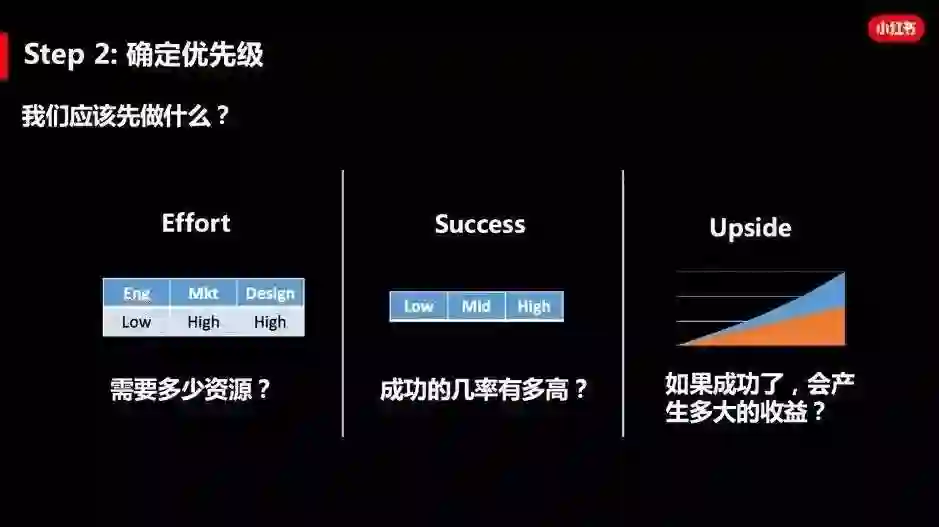 我们应该先做什么呢?关于确定优先级,其实是个比较灵活的操作,因为每个人的视角不同,所以经常会得出不同的优先级结论。在小红书,我们有个简单的方法来判断事情的优先级:第一,你做这件事要投入多少努力?需要多少工程师,需要多少设计师,需要市场部门做些什么?第二,你做这件事成功的概率有多高?是很可能会成功,还是大概率会失败?第三,如果这件事成功了,他会有多大的影响力?潜在的收益有多大?有这样的分析,往往会帮助你和团队更好的判断事情的优先级。