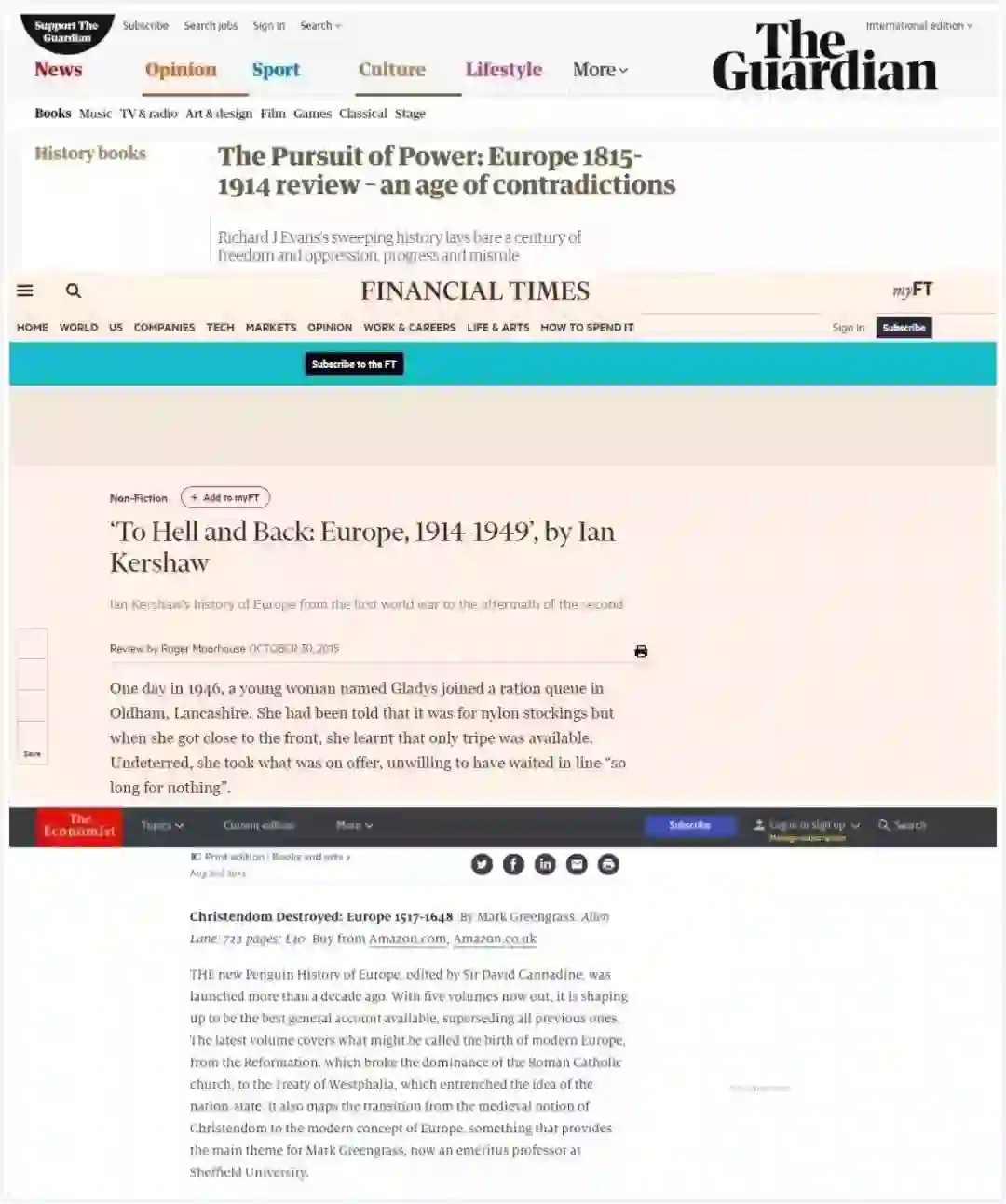 美国《新政治家》评论《企鹅欧洲史》是“当代出版界的巨制”;英国《星期日电讯报》说它是“几十年未见的历史佳作”。