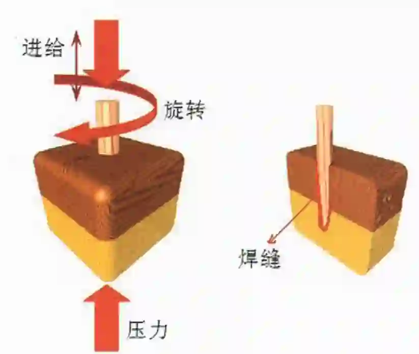 ▲圆棒榫旋转木材焊接示意图