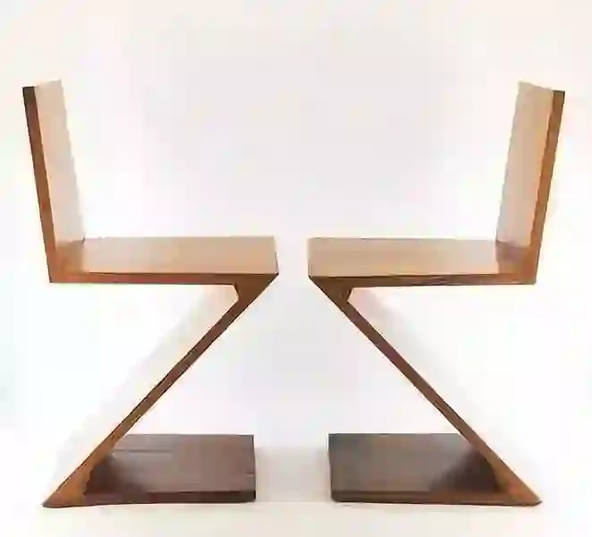 如著名荷兰建筑设计大师赫里特·里特费尔德设计的极简抽象派Z字型椅,用四块榉木板以间距为32mm圆棒榫,不添加任何物质、仅通过圆棒榫旋转焊接组装。