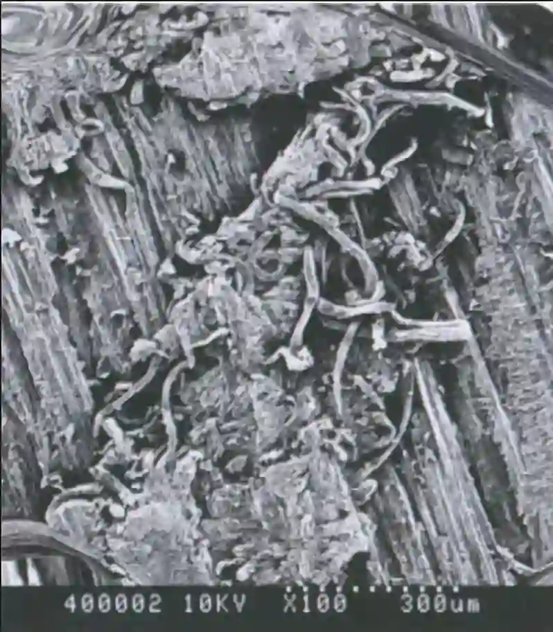 从上图可以看出焊接带的显微互相交织相连,当木材摩擦焊接完成后,在形成的“新界面”木质素和半纤维素(糠醛、木聚糖)发生聚合和交联化学反应,因此圆棒榫停止旋转运动后,为了保证一定的接合强度,还需保持一定瞬时的压力。