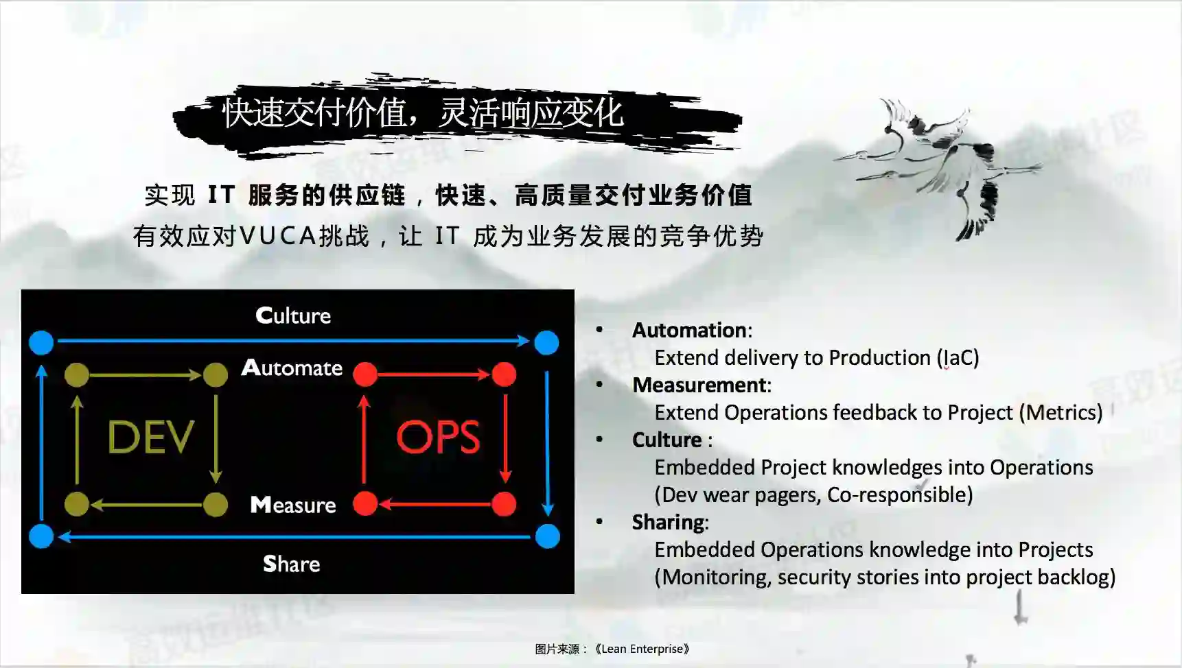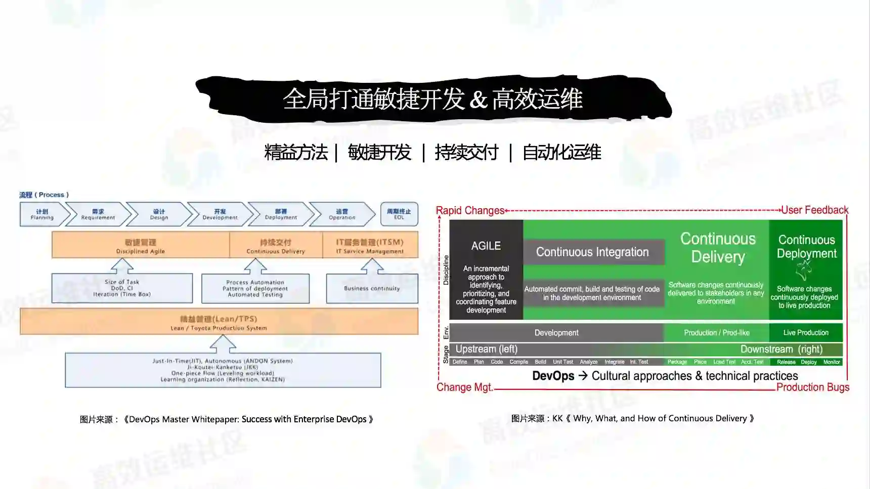 DevOps的法:全局打通敏捷研发与高效运维,实现端到端的交付过程。