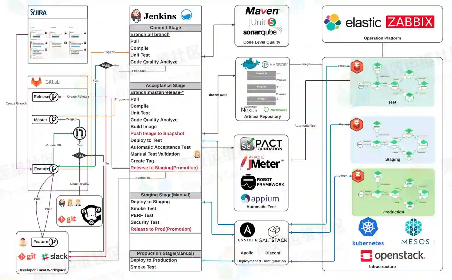 DevOps 强调持续改进,DevOps 全开源交付流水线也在不断演讲,如图是流水线2.0的技术架构图,我们希望支持更广泛,集成更顺畅。