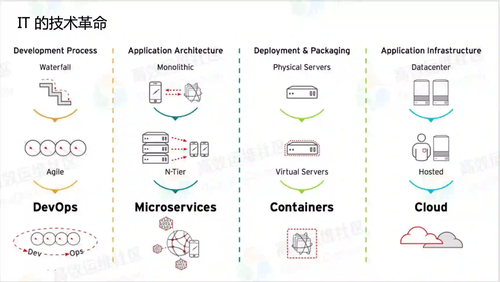 在开发与运维技术领域,应用架构演变为微服务架构,应用环境演变为容器技术,基础设施演变为云平台;在研发模式上,也需要相应的革新,新的方向是:DevOps