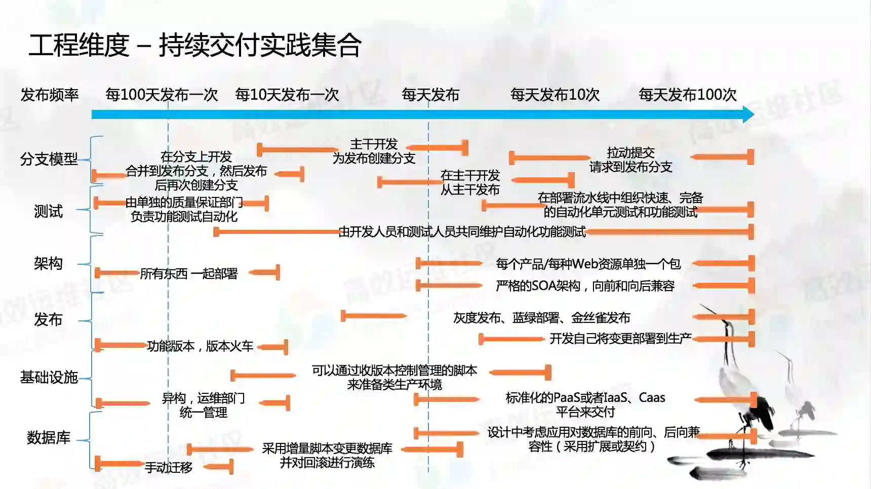 持续交付也是工程实践最集中,应用效果最明显的环节,涉及分支模型、自动化测试、应用架构、发布技术、基础设施、数据库变更策略等等。