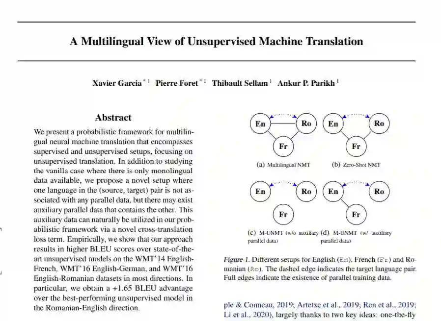 我们提出了一个多语言神经机器翻译的概率框架,它包括监督和非监督设置,重点是无监督翻译。除了研究只有单语数据可用的基本情况外,我们还提出了一种新的设置,即(源、目标)对中的一种语言不与任何并行数据相关联,但可能存在包含另一种语言的辅助并行数据。通过一个新的交叉翻译损失项,这些辅助数据可以很自然地用在我们的概率框架中。经验表明,我们的方法在大多数方向的WMT'14英-法、WMT'16英-德、WMT'16英-罗数据集上,比最先进的无监督模型获得更高的BLEU分数。特别是,我们获得了+1.65 BLEU的优势,在罗马尼亚-英国方向的最佳表现的无监督模式。