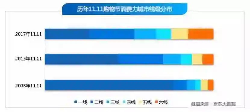 京东大数据显示,2017年11.11期间,六线城市用户数是2008年的6700倍,五线城市用户数是2008年的3400倍,高于全站增速。来自低线级城市的购买力持续攀升,紧跟一二线用户,甚至有超越三四线城市的态势。