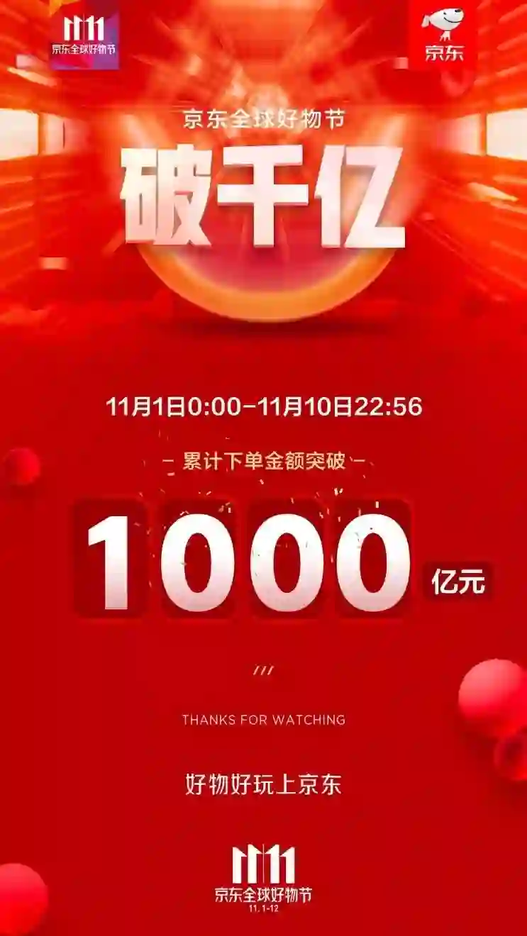 京东更牛,10号晚上10点56分,京东在11月1号至11月10号期间的成交额率先突破1000亿。