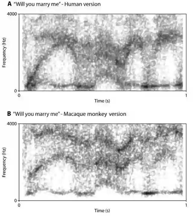 人类与“猕猴”表达“will you marry me?”时的声波频谱对比。上图为人类版本,下图为“猕猴”版本,横轴为时间,纵轴为声波频率。图片来源: 参考文献[4]