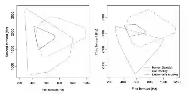 人类说话或唱歌产生的声音包含许多不同的频率,共振峰(即发出声音时可以被作为特征识别的关键频率)是使听者能够区分元音的关键泛音[8]。Ghazanfar实验室的研究结果显示,猕猴的发音空间并不像Lieberman 五十年前用石膏模型预测出的结果那么悲观,猕猴的元音共振峰空间图谱倒是与人类女性有很大一部分重叠。