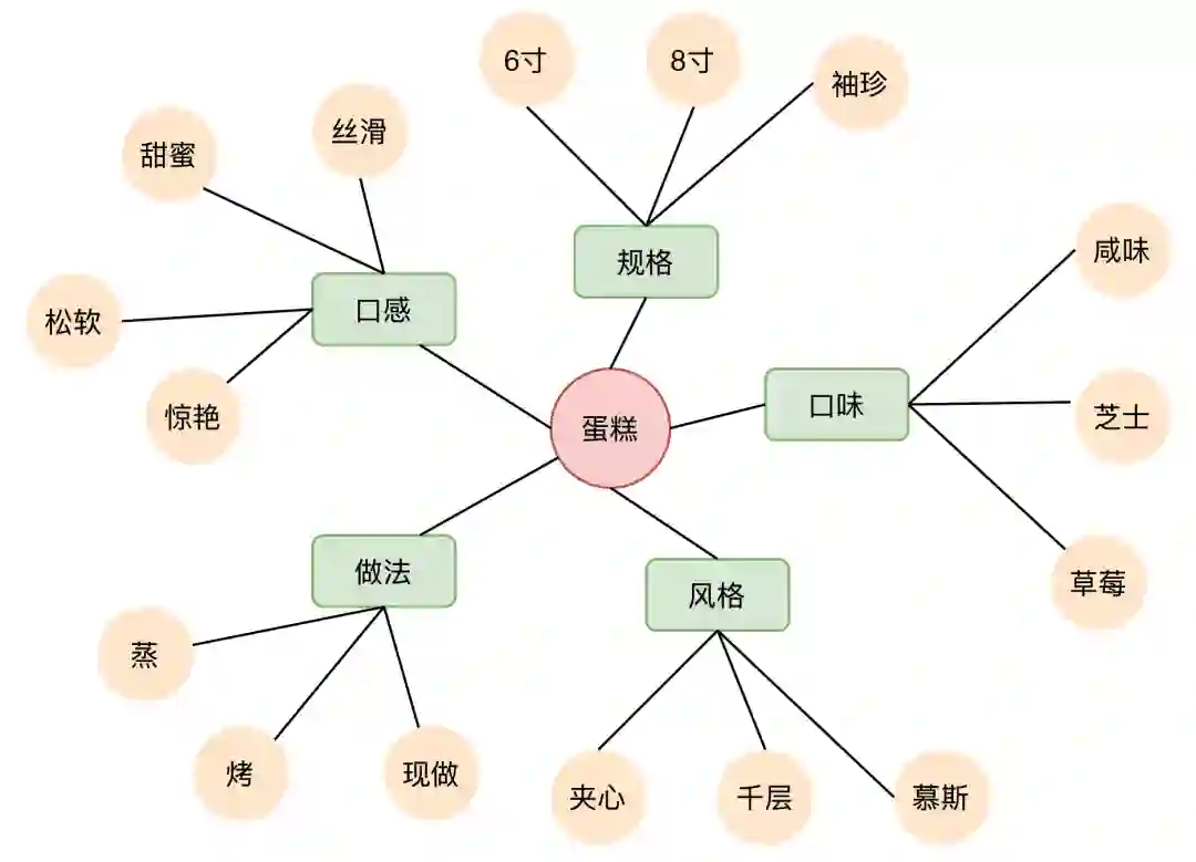 在常识性概念图谱中,建立了很丰富的概念以及对应属性及其属性值的关系,通过一个相对比较泛的Query,可以生成对应细化的Query。例如蛋糕,可以通过口味这个属性,产出草莓蛋糕、芝士蛋糕,通过规格这个属性,产出6寸蛋糕、袖珍蛋糕等等。