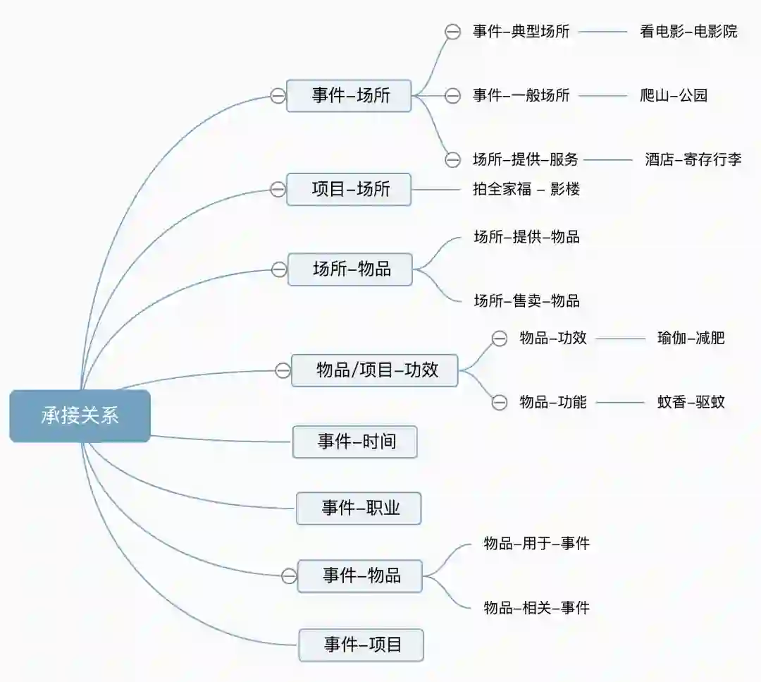概念承接关系:这类关系主要建立用户搜索概念和美团承接概念之间的链接,例如踏春-场所-植物园,减压-项目-拳击等。