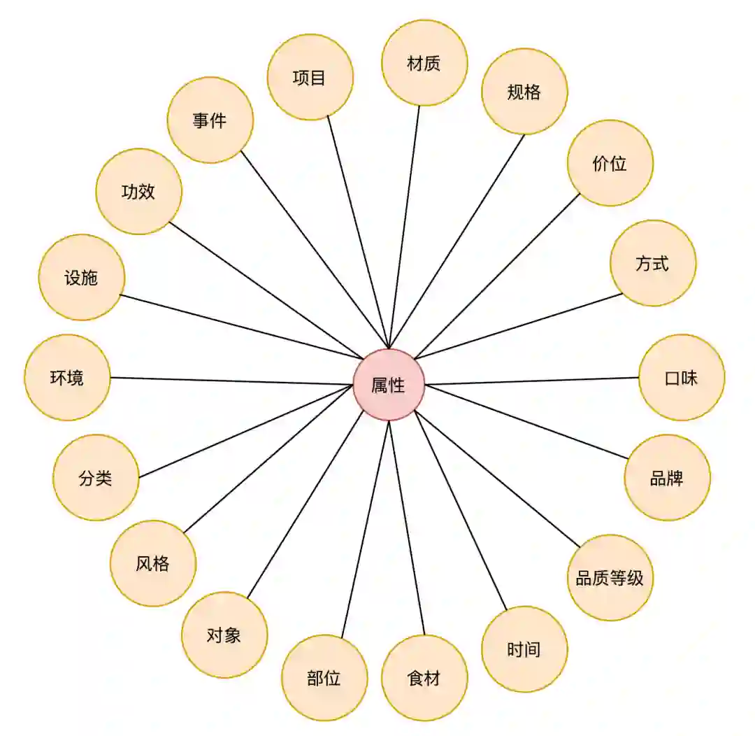 概念属性关系:是典型的CPV(Concept-Property-Value)关系,从各个属性维度来描述和定义概念,例如火锅-口味-不辣,火锅-规格-单人等,示例如下: