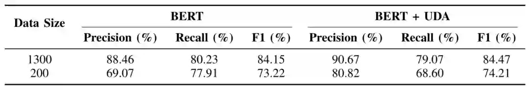 在训练数据构造上,由于上下位关系表述的句子非常稀疏,大量共现的句子并没有明确的表示出候选关系对是否具有上下位关系,利用已有上下位关系采取远程监督方式进行训练数据构建不可行,所以直接使用人工标注的训练集对模型进行训练。由于人工标注的数量比较有限,量级在千级别,这里结合Google的半监督学习算法UDA(Unsupervised Data Augmentation)对模型效果进行提升,最终Precision可以达到90%+,详细指标见表1:
