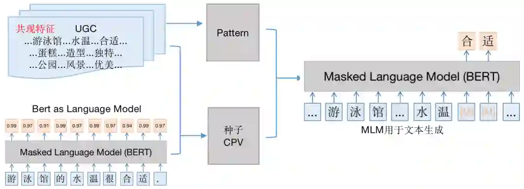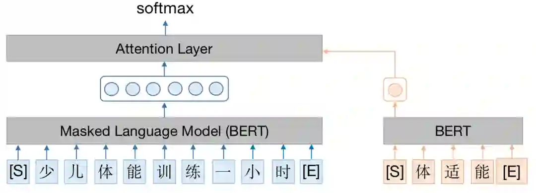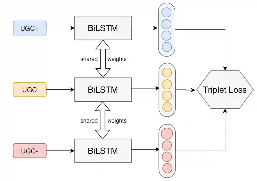具体来说,我们观察到不同商户类目下用户评论中实体的分布差异较大。例如,美食类目下的UGC经常涉及到“聚餐”、“点菜”、“餐厅”;健身类目下的UGC经常涉及到“减肥”、“私教”、“健身房”;而“装修”、“大厅”等通用实体在各个类目下都会出现。因此,我们构建了三元对比学习网络,使得同类目下的用户评论表示靠近,不同类目的用户评论表示远离。与Word2Vec等预训练词向量系统类似,通过该对比学习策略得到的词向量层天然蕴含丰富的关系信息。在预测时,对于任意的用户搜索概念,可以通过计算其与所有承接概念之间的语义相似度,辅以搜索业务上的统计特征,得到一批高质量的种子数据。