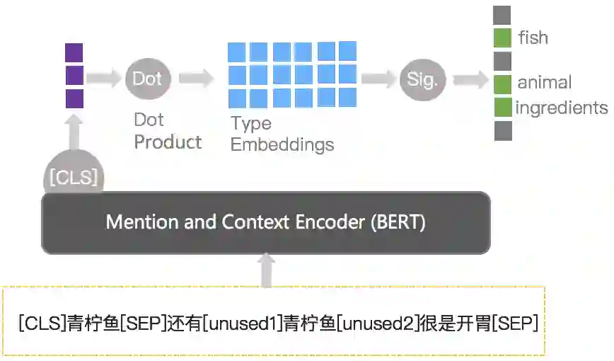 概念-Taxonomy间上下位关系是通过人工定义的知识体系理解一个概念是什么,由于Taxonomy类型是人工定义好的类型,可以把这个问题转化成一个分类问题。同时,一个概念在Taxonomy体系中可能会有多个类型,如“青柠鱼”既是一种“动物”,也属于“食材”的范畴,所以这里最终把这个问题作为一个Entity Typing的任务来处理,将概念及其对应上下文作为模型输入,并将不同Taxonomy类别放在同一空间中进行判断,具体的模型结构如下图所示: