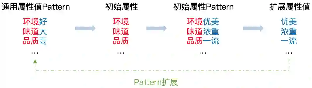 开放属性关系需要挖掘不同概念特有的属性和属性值,它的难点在于开放属性和开放属性值的识别。通过观察数据发现,一些通用的属性值(例如:好、坏、高、低、多、少),通常和属性搭配出现(例如:环境好、温度高、人流量大)。所以我们采取一种基于模板的Bootstrapping方法自动从用户评论中挖掘属性和属性值,挖掘流程如下: