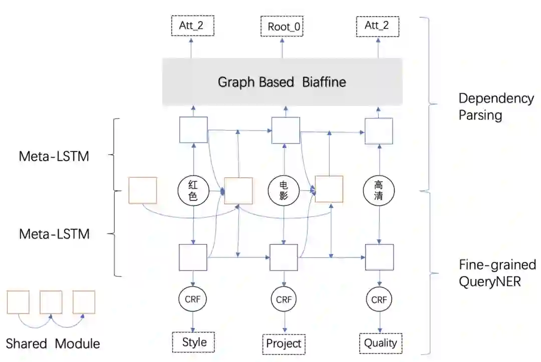 依存分析和细粒度NER有可以互相利用的信息,例如“毕业公仔”,「时间(Time)」和「产品(Product))」的实体类型,与「公仔」是核心词的依存信息,可以相互促进训练,因此将两个任务联合学习。但是由于两个任务之间的关联程度并不明确,存在较大噪声,使用Meta-LSTM,将Feature-Level的联合学习优化为Function-Level的联合学习,将硬共享变为动态共享,降低两个任务之间噪声影响。