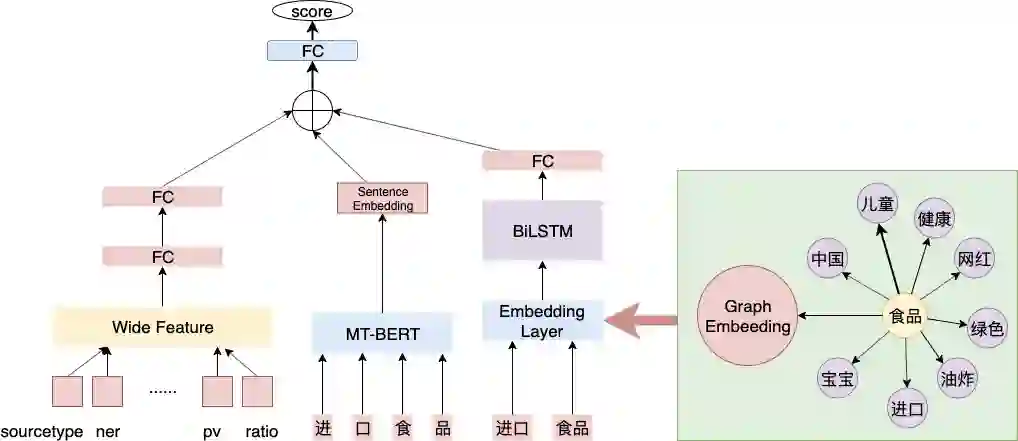复合概念候选来自于原子概念的组合,由于涉及组合,复合概念的判断比原子概念判断更为复杂。复合概念要求在保证完整语义的同时,在美团站内也要有一定的认知。根据问题的类型,采用Wide&Deep的模型结构,Deep侧负责语义的判断,Wide侧引入站内的信息。