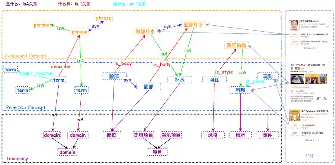 总结下来,涵盖“是什么”的概念Taxonomy体系结构,“什么样”的概念属性关系,“给什么”的概念承接关系。同时POI(Point of Interesting)、SPU(Standard Product Unit)、团单作为美团场景中的实例,需要和图谱中的概念建立连接。