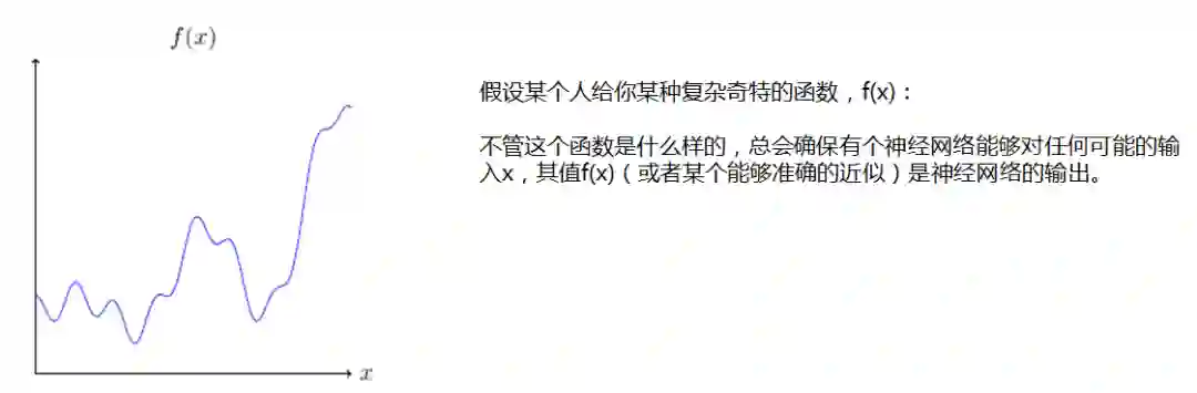 不管这个函数是什么样的,总会确保有个神经网络能够对任何可能的输入x,其值f(x)(或者某个能够准确的近似)是神经网络的输出。