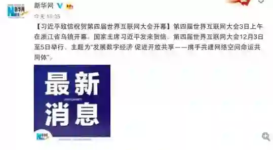 据新华网报道,第四届世界互联网大会于今天(12月3日)上午在浙江省乌镇开幕。国家主席习近平发来贺信。