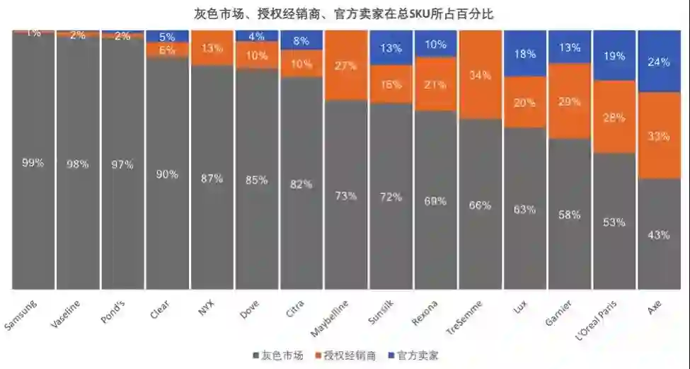 根据市场分析平台 BrandIQ 提供的数据,联合利华、三星、欧莱雅等消费产品巨头平均 80% 的库存量单位(SKU)是由未经授权的灰色市场经销商出售。这些灰色市场 SKU 的售价比官方旗舰店和授权经销商低 30%。