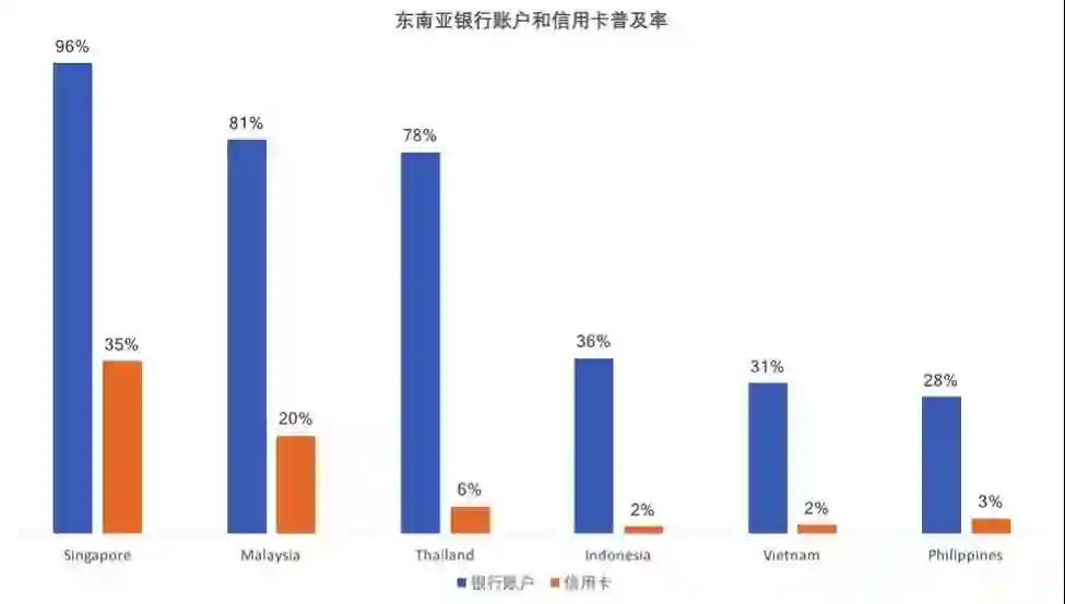 在大部分新兴东南亚市场(不包括新加坡和马来西亚),信用卡普及率都很低,大多数人甚至没有银行账户。