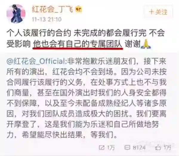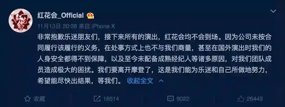 “非常抱歉乐迷朋友们,接下来所有的演出,红花会均不会到场。因为公司未按合同履行该履行的义务,在处事方式上也不与我们商量,甚至在国外演出时我们的人身安全都得不到保障,以及至今未配备成熟经纪人等诸多原因,对我们团队成员造成极大的困扰。我们要离开摩登了,这是我们能为乐迷和自己所做地努力,希望能尽快出结果,等我们。”
