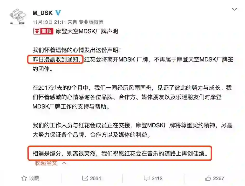 过了不到一个小时,摩登天空MDSK官方微博“M_DSK”(摩登天空HipHop厂牌)作出了回应:“昨日凌晨收到通知,红花会将离开MDSK 厂牌,不再属于摩登天空MDSK厂牌签约团体。”
