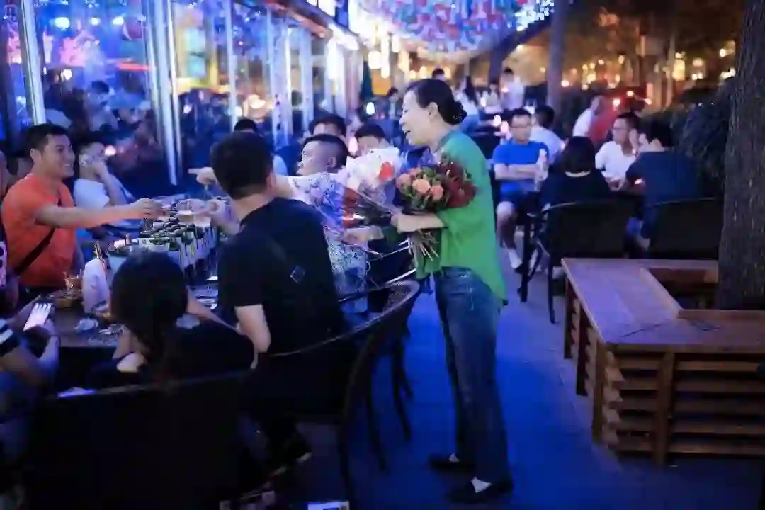 李会兰在三里屯酒吧卖花