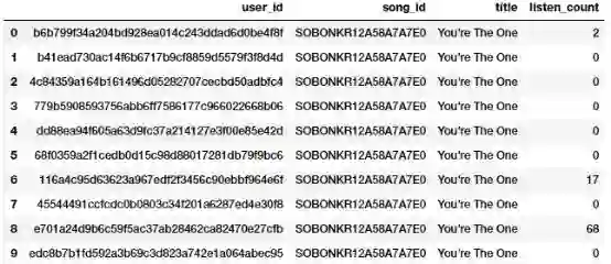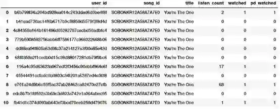 你可以从上面的图片中清楚地看到,这两种方法都产生了相同的结果。因此,我们获得了一个二进制特征,指示每个用户是否听过这首歌,然后可以在相关模型中进一步使用。