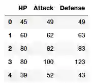 poke_df[['HP', 'Attack', 'Defense']].head()