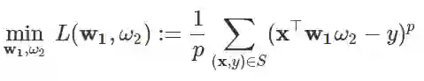 这里 S 代表一个训练集,它由一对(x,y)组成,其中 x 是一个表征事件的向量,y 是一个表征其标签的(数值)标量;w 是我们想要学习的参数向量。现在,让我们用向量 w_1 乘上标量 ω_2 替换向量 w,把线性模型转换成一个非常简单的深度为 2 的网络。显然,这种过参数化操作并没有改变网络的表现力,但却生成了非凸目标函数(non-convex):
