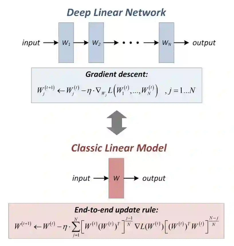 假设我们有兴趣来学习一个线性模型,其参数化由矩阵 W 完成,通过一些训练损失函数 L(W) 极小化来得到。我们不直接用使用矩阵 W,而是将其替代为一个深度为 N 的线性神经网络,例如我们将其过参数化成 W=W_NW_N−1⋯W_1,其中 W_j 是特定层的权重矩阵。在文中,我们指出如果人们在 W_1…W_N 上以低学习率η应用梯度下降,且有: