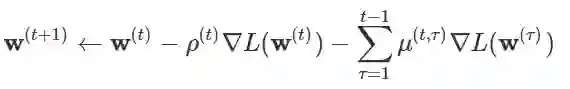 其中ρ^(t) 和μ^(t,τ) 可被恰当地定义为(依赖时间的)系数。因此,看似一个正常的乘法标量的加法将普通的梯度下降转换成了一个以某种方式记录了过往的梯度(momentum 方法的关键特征)以及随时间变化学习速率有所差异的组合形式。尽管对 momentum 方法之精确好处的理论分析绝不容易,但是一项基于 UCI 机器学习库的「Gas Sensor Array Drift at Different Concentrations」数据集的简单实验(p=4)为我们展示了如下的效果: