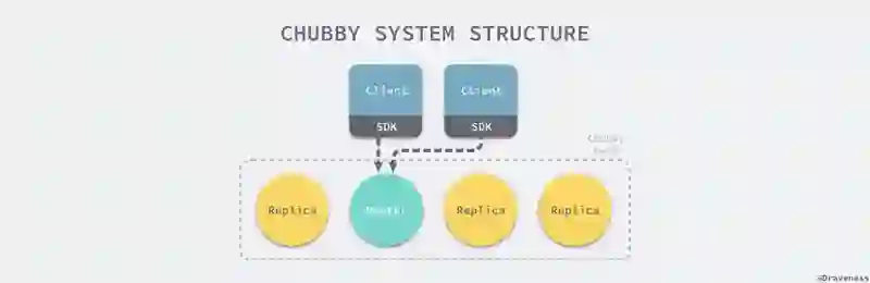 在一个 Chubby Cell 中,只有 主节点会对外提供读写服务,其他的节点其实都是当前节点的副本(Replica),它们只是维护一个数据的拷贝并会在主节点更新时对它们持有的数据库进行更新;客户端通过向副本发送请求获取主节点的位置,一旦它获取到了主节点的位置,就会向所有的读写请求发送给主节点,直到其不再响应为止。写请求都会通过一致性协议传播到所有的副本中,当集群中的多数节点都同步了请求时就会认为当前的写入已经被确认。