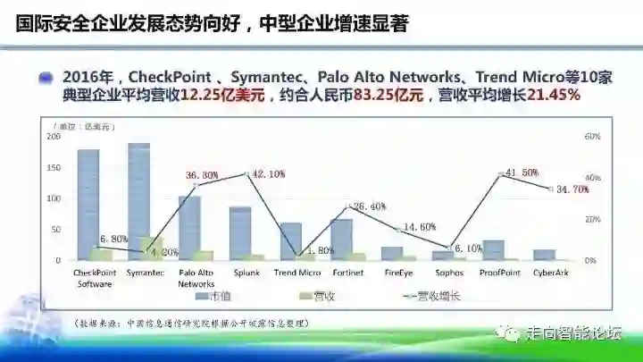 国际安全企业发展态势向好,中型企业增速显著。2016年,CheckPoint、Symantec、Palo Alto Networks、Trend Micro等10家典型企业平均营收12.25亿美元,约合人民币83.25亿元,营收平均增长21.45%。