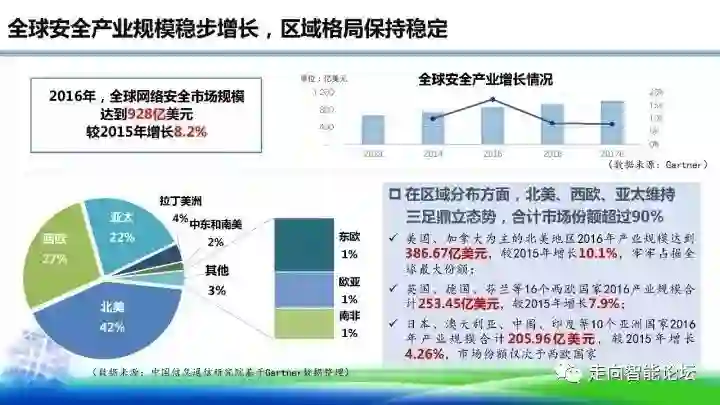 刘多院长在演讲中指出,全球安全产业规模稳步增长,区域格局保持稳定。2016年,全球网络安全市场规模达到928亿美元,较2015年增长8.2%。在区域分布方面,北美、西欧、亚太维持三足鼎立态势,合计市场份超过90%。